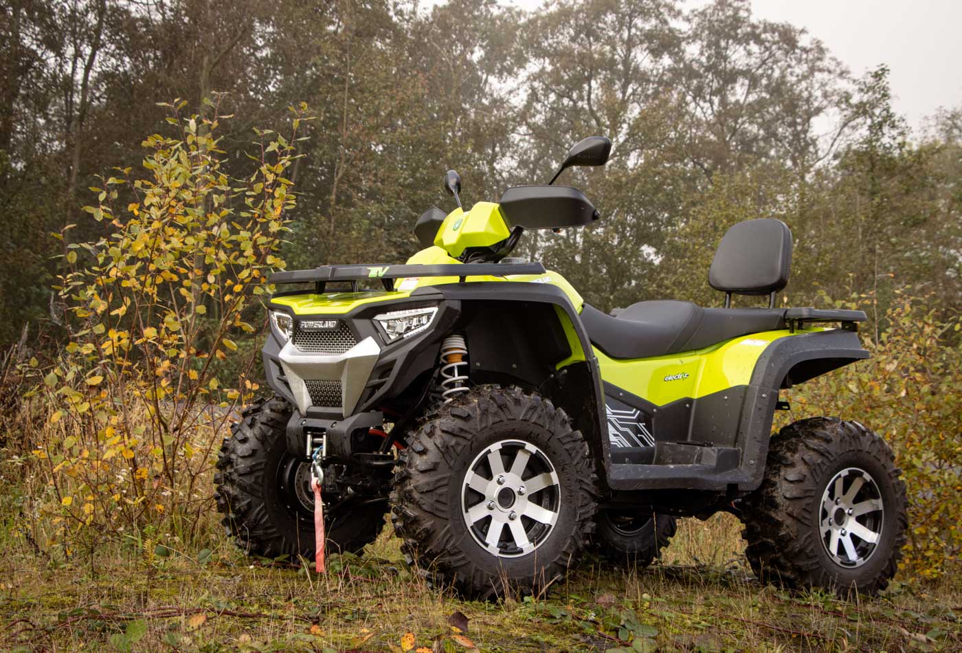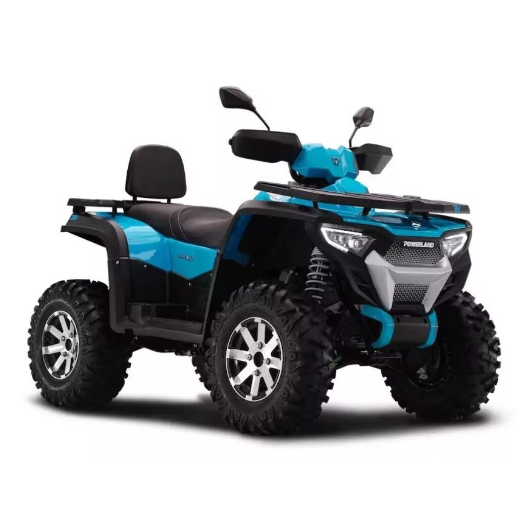 Les dimensions du Powerland Tachyon sont de 2350 x 1350 x 1420 mm, pour un empattement de 1455mm et une garde au sol de 300 mm. Vous l’aurez compris, ce quad électrique est plutôt robuste et stable au sol, avec un poids à vide de 375 Kg. Il est équipé de pneus radiaux à 6 plis 25×8-12 à l’avant et 25×10-12 à l’arrière, et de freins à disques ventilés avant et arrière.