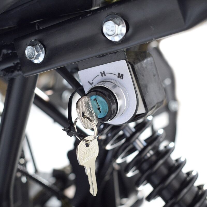 Par ailleurs, le Samouraï 48 V 1800 W propose trois niveaux de vitesse que vous pouvez sélectionner par clé de bridage (lente, moyenne, haute). Cela vous permet d’ajuster la puissance selon le niveau de votre enfant. Une fois la clé retirée, votre aventurier en herbe ne pourra plus modifier les réglages et ce, pour un contrôle parental total.